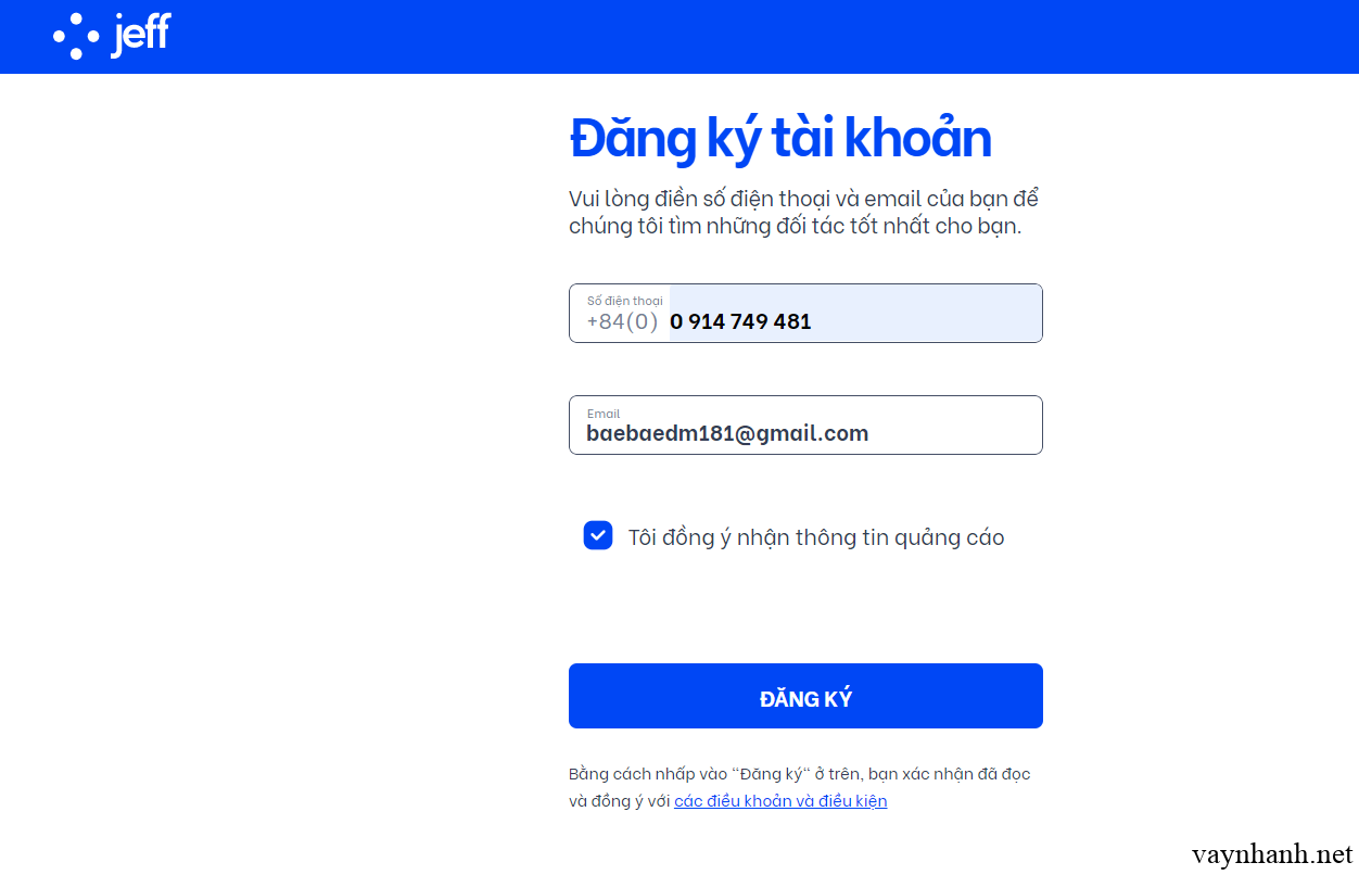 Đăng ký tài khoản vay tại Jeff App. Bạn tiến hành nhập số điện thoại cùng địa chỉ Email vào để đăng ký tài khoản tại Jeff.