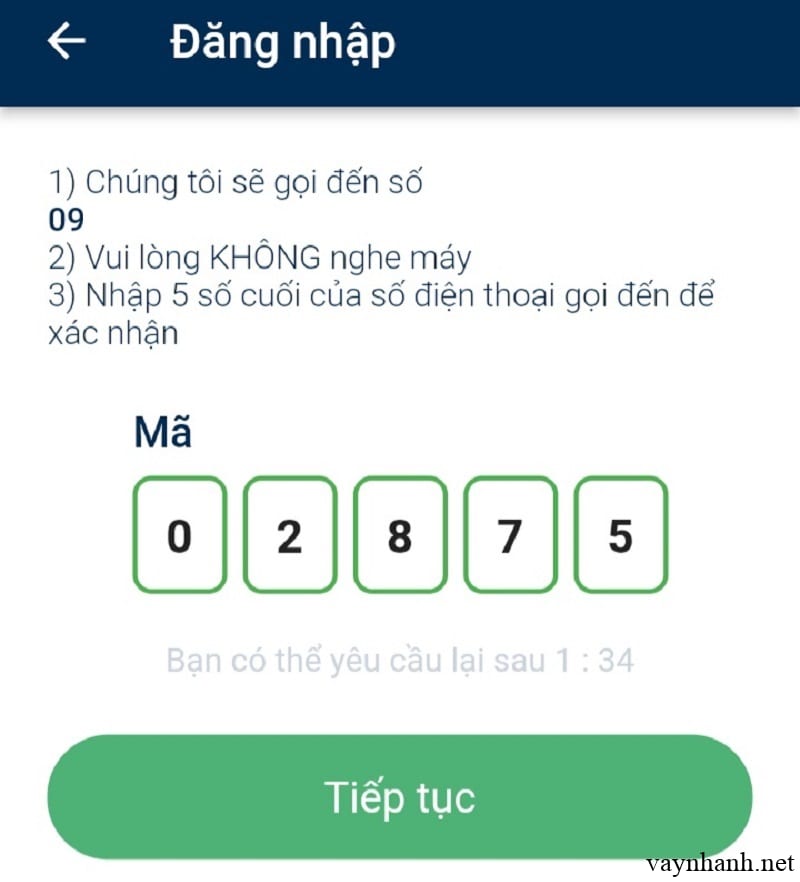 - Bước 3: Người dùng cần chờ hệ thống xác minh thông tin, thông thường hệ thống sẽ thực hiện cuộc gọi đến số điện thoại bạn đã đăng ký. Khách hàng không được nghe máy mà chỉ cần nhập 5 số cuối của số điện thoại gọi đến để làm mã xác thực.
