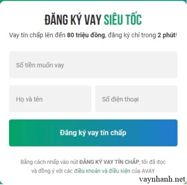 Bạn hãy truy cập vào website Avay: https://avay.vn/ hoặc ứng dụng trên điện thoại. Một hộp thoại sẽ hiện ra bạn cần điền thông tin bao gồm Số tiền muốn vay, Họ và tên, số điện thoại theo yêu cầu rồi nhấn Đăng ký vay tín chấp để chuyển sang bước tiếp theo.
