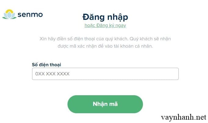 - Bước 2 : Nhập số điện thoại bạn đăng ký vay tiền Online Senmo và bấm nhập mã