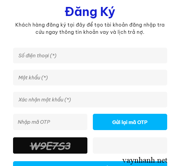 - Cung cấp các thông tin đăng ký tài khoản theo yêu cầu của hệ thống như: Số điện thoại, Mật khẩu, Mã xác thực OTP, mã Captcha => Cung cấp số điện thoại trùng khớp với số điện thoại đăng ký vay tại Mcredit