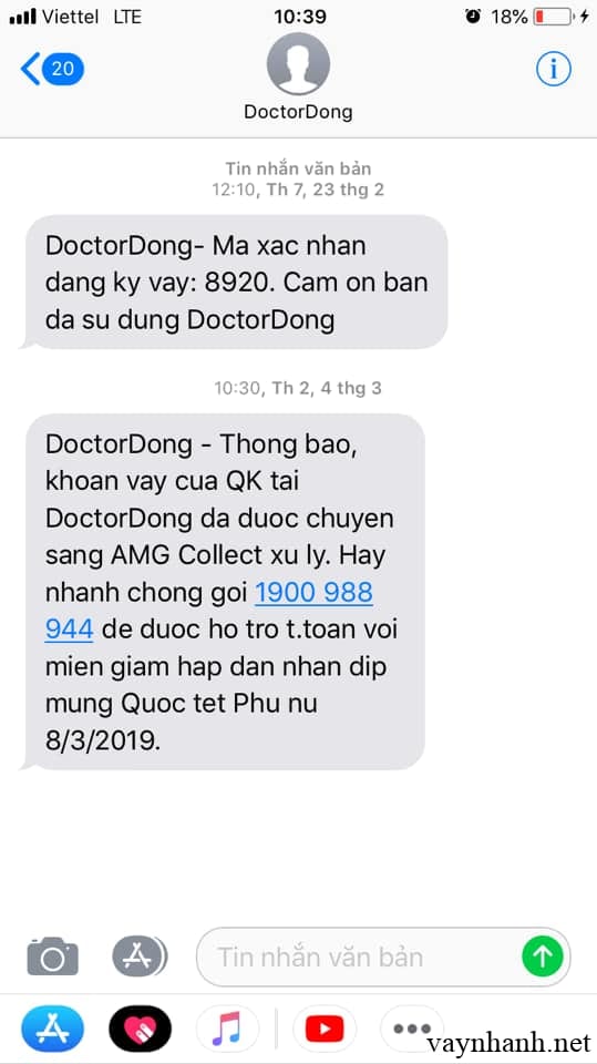 Khi sắp đến hạn thanh toán, DoctorDong sẽ thông báo trước cho người vay. Nếu đã quá hạn thanh toán mà người đi vay vẫn chưa thanh toán đầy đủ thì nhân viên của DoctorDong sẽ tiếp tục gọi điện, gửi tin nhắn đến cho khách hàng. Đây là mức độ đòi nợ nhẹ nhất của ứng dụng này.