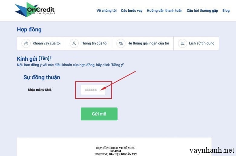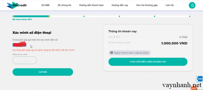 Sau đó, OnCredit gửi mã xác nhận cho bạn bằng cuộc gọi qua số điện thoại của bạn. Bạn điền mã vừa nhận được bấm “Gửi mã”