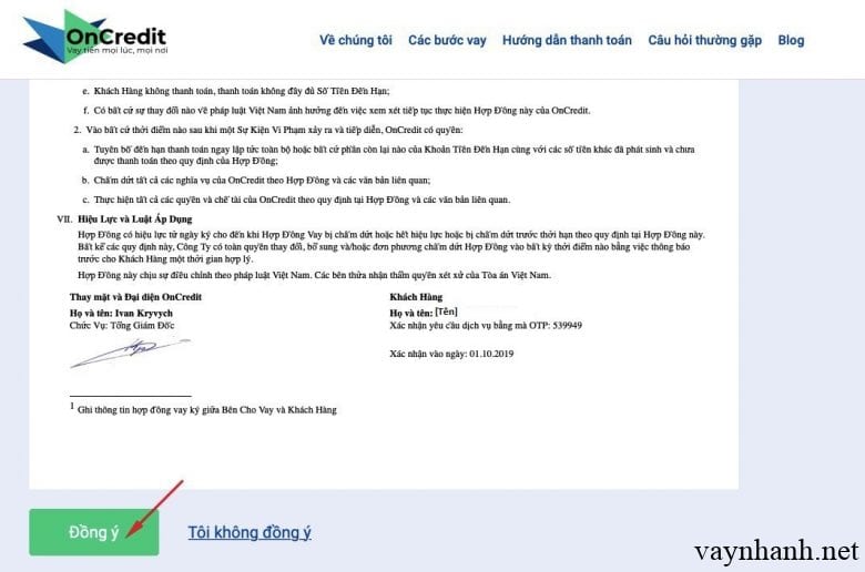 Nếu khoản vay được duyệt, bạn sẽ nhận được tin nhắn SMS đến số điện thoại bạn đăng ký để thông báo về khoản vay. Tiếp theo bạn cần đăng nhập vào tài khoản trên OnCretdit để kiểm tra lại khoản vay, lãi suất, các khoản phí dịch vụ và kí hợp đồng.
