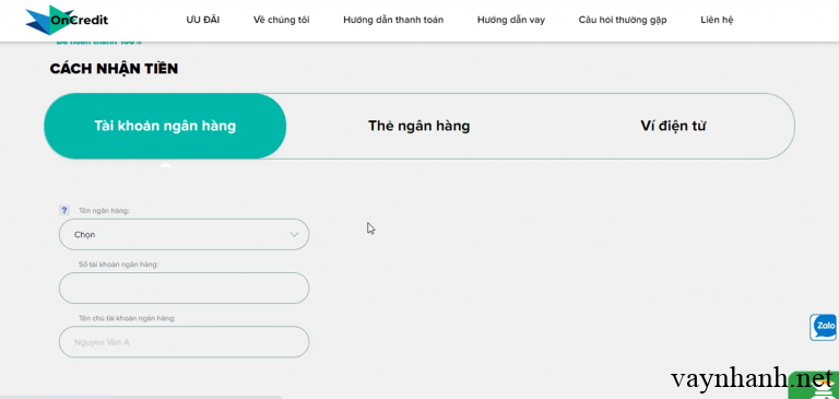 Bạn điền phương thức giải ngân để OnCredit có thể giải ngân cho bạn bằng các hình thức: Tài khoản ngân hàng, Thẻ ngân hàng, Ví điện tử.