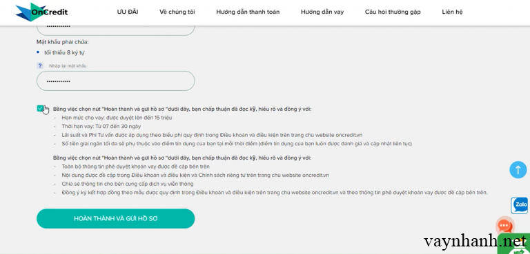 Sau đó, bạn kéo xuống dưới để điền thêm mật khẩu bạn muốn sử dụng cho tài khoản ở OnCredit.
