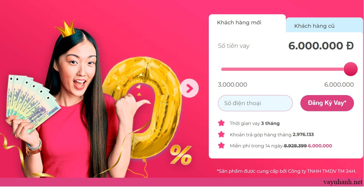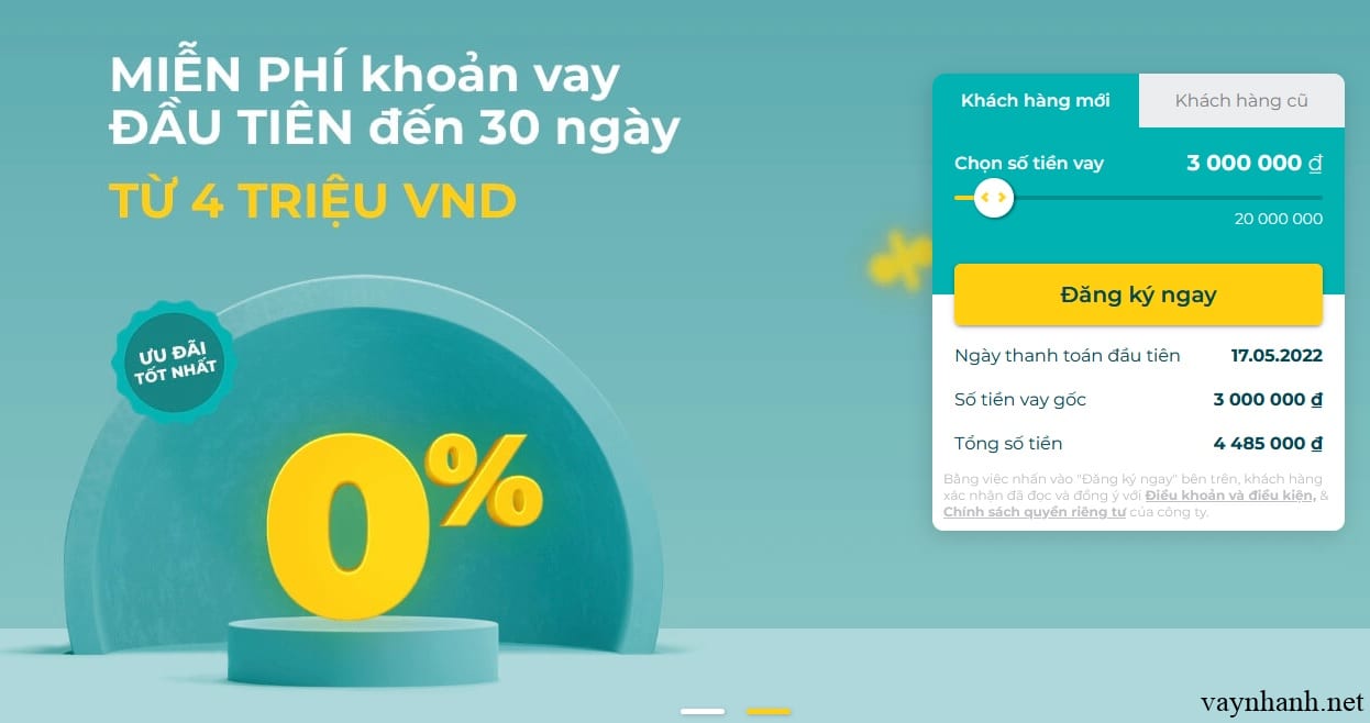 Đối với khoản vay đầu tiên: %0 lãi và phí, tối đa 4 triệu trong kỳ hạn 5 ngày.