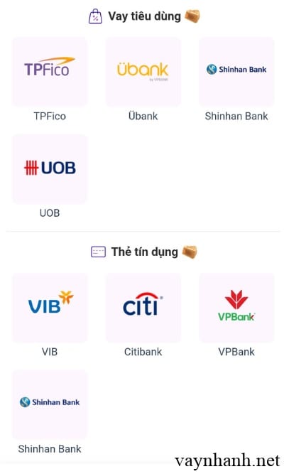 | Khoản vay | FE – FE Credit | UBank – VPBank | TPFico – TPBank | Shinhan Bank | Vay UOB |