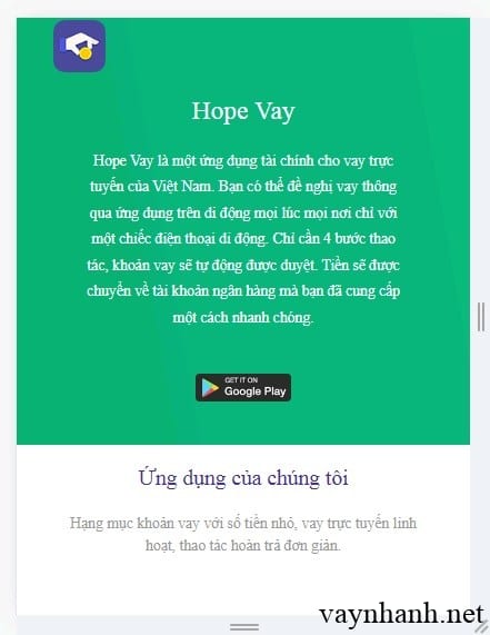 Hope Cash hay còn gọi Hope Vay, là ứng dụng cung cấp dịch vụ vay tiền online tại Việt Nam. Tất cả quy trình đăng ký gói vay nhanh được thực hiện online thông qua điện thoại thông minh, không cần phải gặp mặt giúp tiết kiệm thời gian.