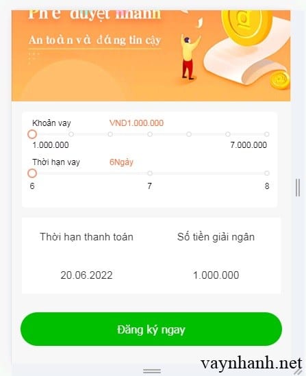 - Bước 1: Chọn hạn mức vay (từ 1 – 7 triệu). Chọn thời hạn vay (từ 6 – 8 ngày). Nhấp vào “Đăng ký ngay”.