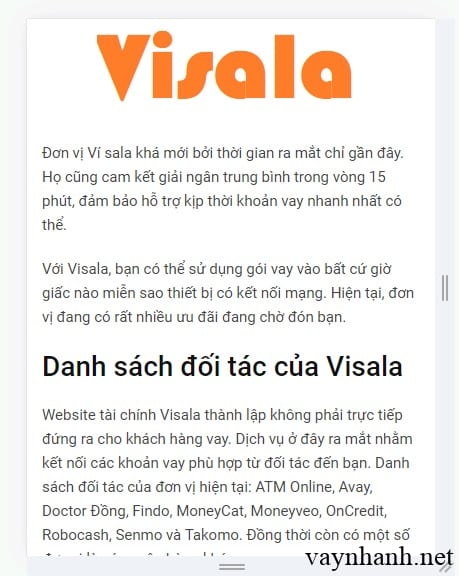 Visala còn được gọi là Ví Sala được biết đến là một web/app cũng cấp dịch vụ tài chính chuyên hoạt động trên nền tảng trực tuyến. Đồng thời, đây cũng được xác định là một đơn vị đảm nhận nhiệm vụ tư vấn tài chính và gợi ý những gói vay phù hợp nhất với nhu cầu của từng khách hàng. Nói một cách dễ hiểu nhất, quý khách hàng có thể đăng ký các khoản vay tiền online từ những đối tác tiềm năng thông qua trang chủ của Visala.