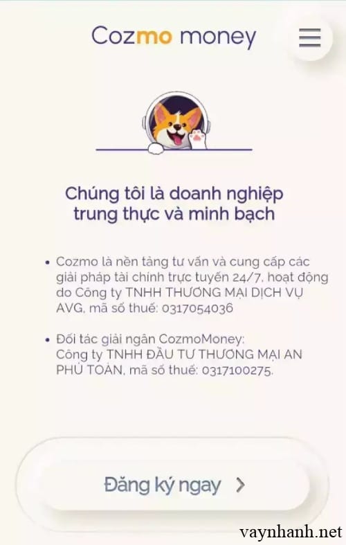 - Đối tác giải ngân CozmoMoney: Công ty TNHH ĐẦU TƯ THƯƠNG MẠI AN PHÚ TOÀN, mã số thuế: 0317517608.