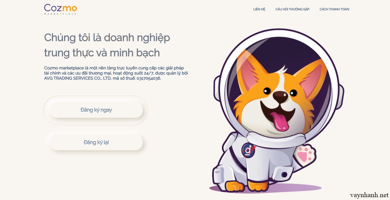 - CozmoMoney là nền tảng tư vấn và cung cấp các giải pháp tài chính trực tuyến 24/7, hoạt động do Công ty TNHH THƯƠNG MẠI DỊCH VỤ AVG, mã số thuế: 0317511814.