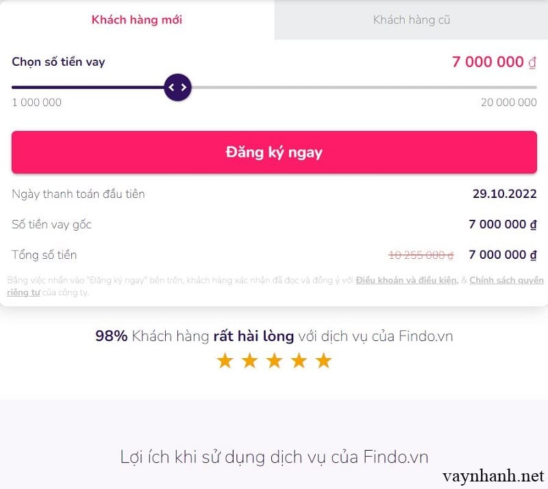 Để có tài khoản Findo, người dùng cần truy cập vào trang web chính thức của ứng dụng tại đây. Bạn có thể đăng ký tài khoản bằng cách chọn số tiền mình muốn vay (kéo thanh trượt ngang để xác định mốc tiền), sau đó nhấn “Đăng ký ngay”.