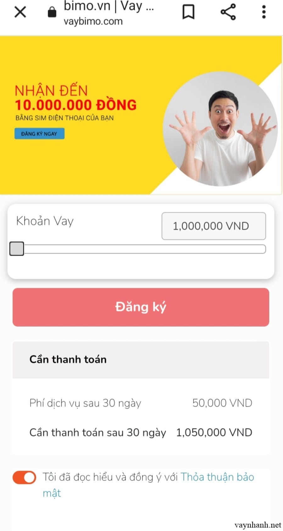 - Vay tiền Bimo nhanh đang hỗ trợ vay vốn với lãi suất từ 500.000đ và tối đa 10.000.000đ, kỳ hạn thanh toán trong vòng 91 – 182 ngày.