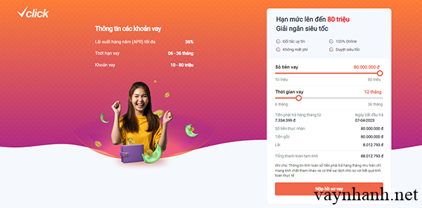 | Vclick | 6-36 tháng | 10-80 triệu | 18-36%/năm | VAY NGAY |